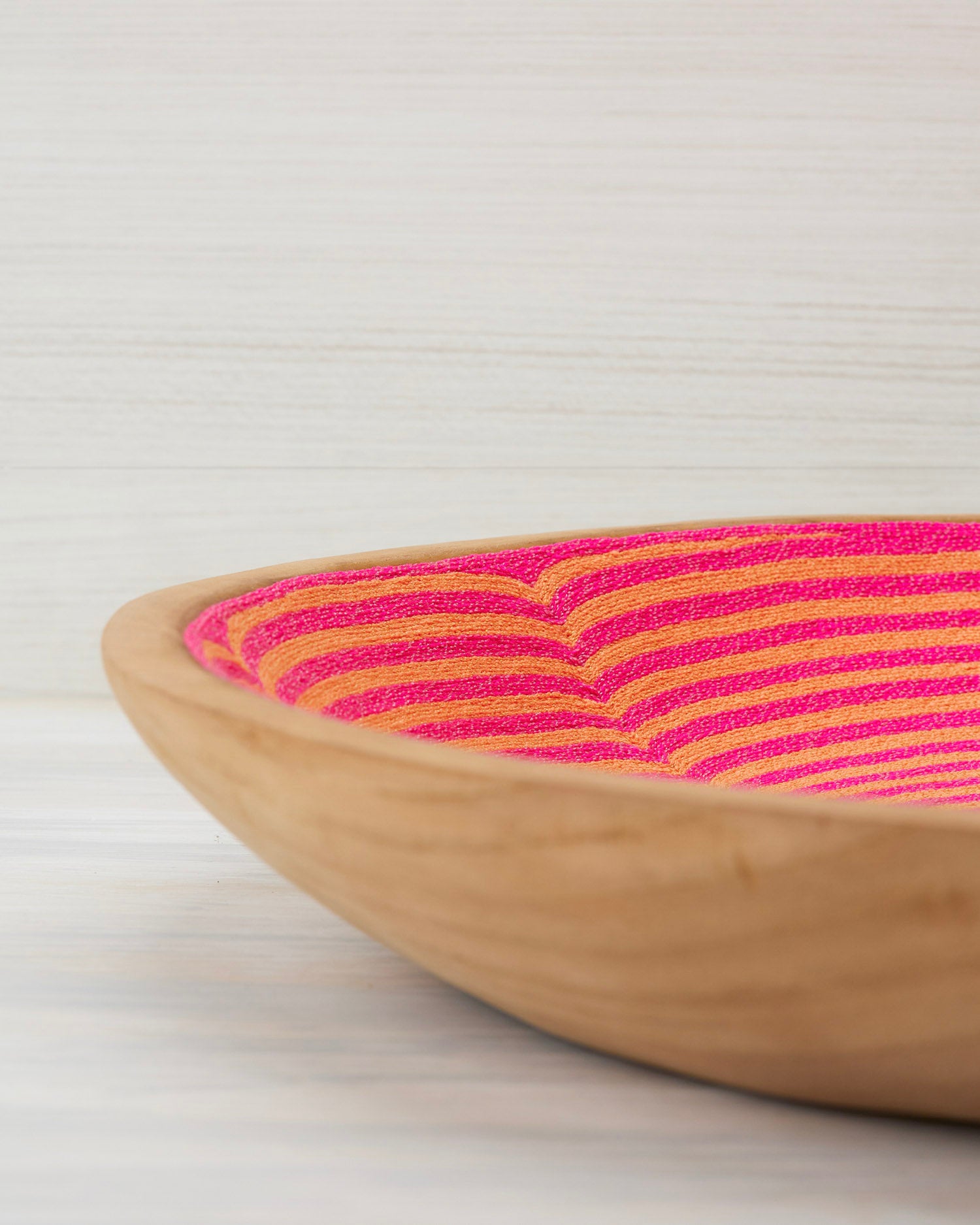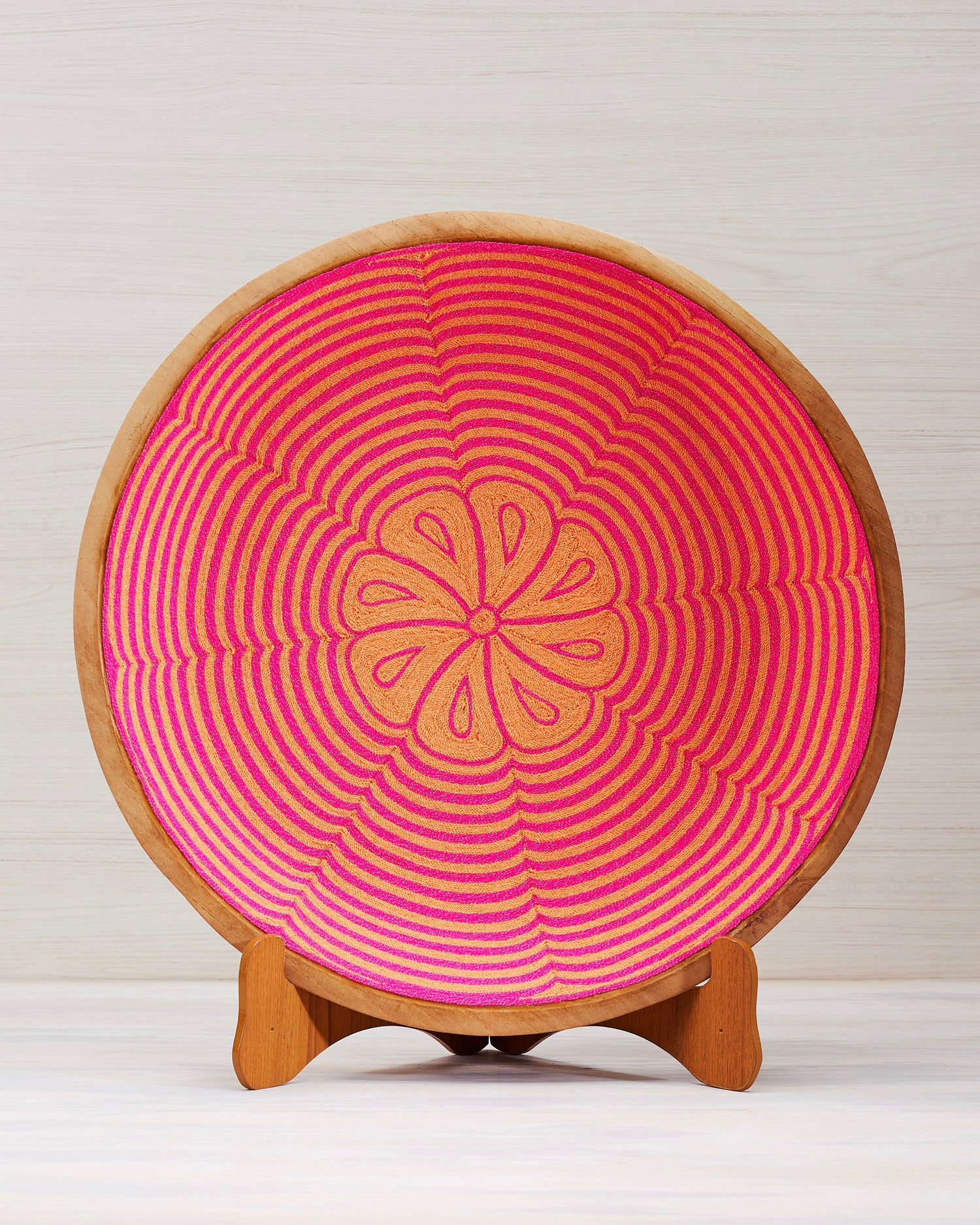 This decorative batea design uses traditional Wixaritari iconography while nodding to the 1968 Olympic Games poster - a design originally inspired by Huichol art. Peyote is the doorway to the spirit world in Huichol culture; believed to have grown from the footsteps of the gods. Each piece is handmade using yarn set in beeswax, lining the hand-carved wooden base - a perfect example of the extraordinary craftsmanship of the Wixárika people.