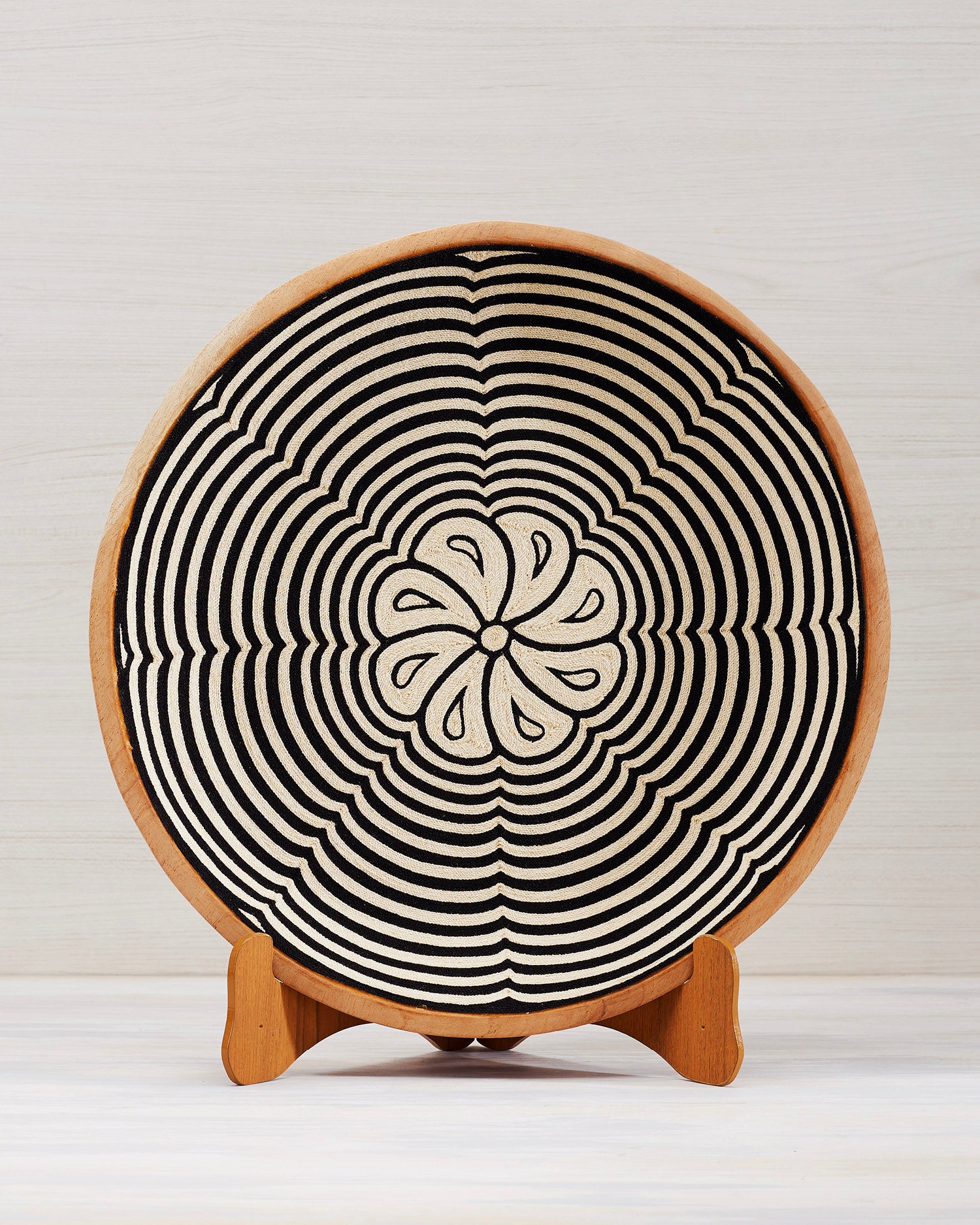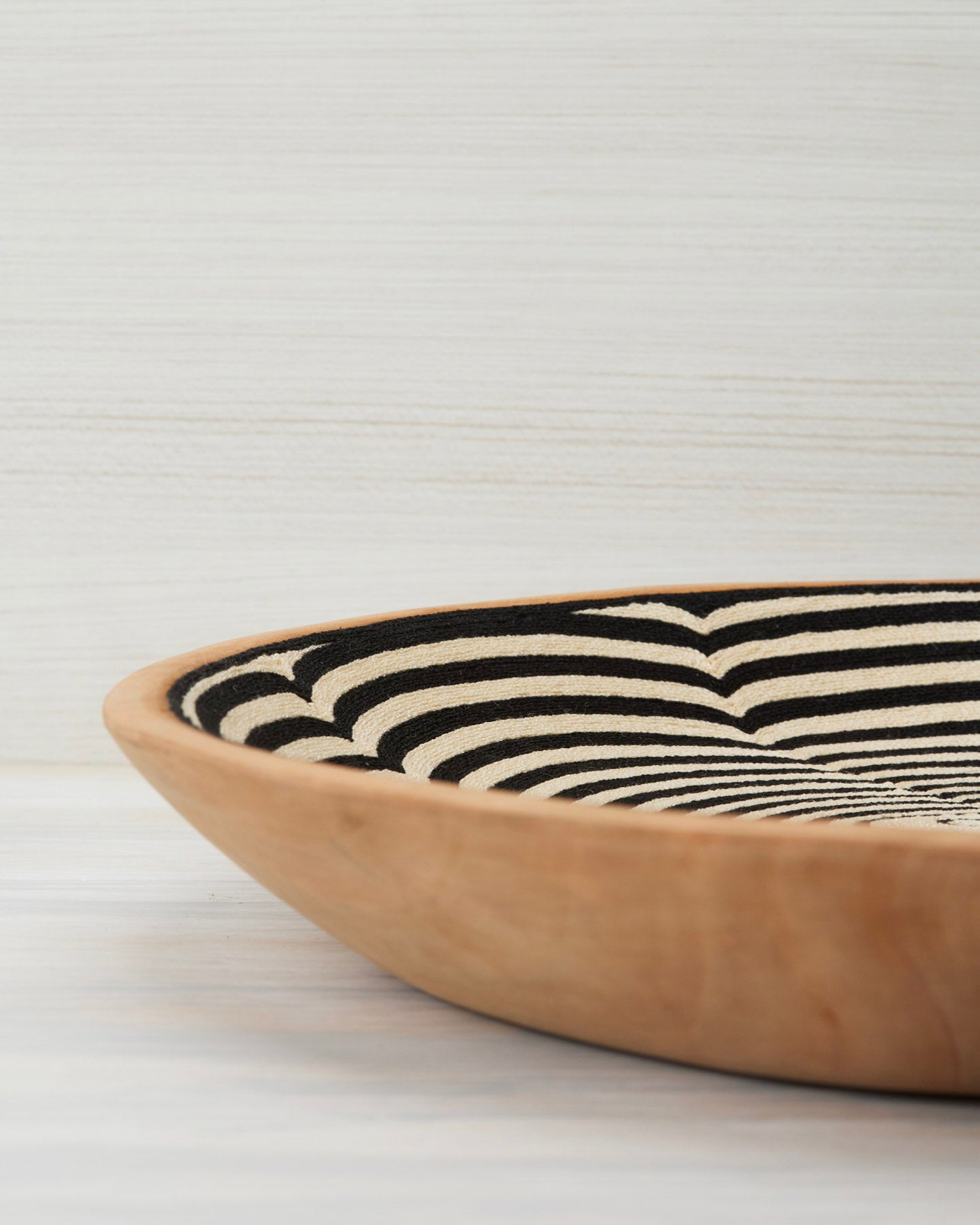 This decorative batea design uses traditional Wixaritari iconography while nodding to the 1968 Olympic Games poster - a design originally inspired by Huichol art. Peyote is the doorway to the spirit world in Huichol culture; believed to have grown from the footsteps of the gods. Each piece is handmade using yarn set in beeswax, lining the hand-carved wooden base - a perfect example of the extraordinary craftsmanship of the Wixárika people.